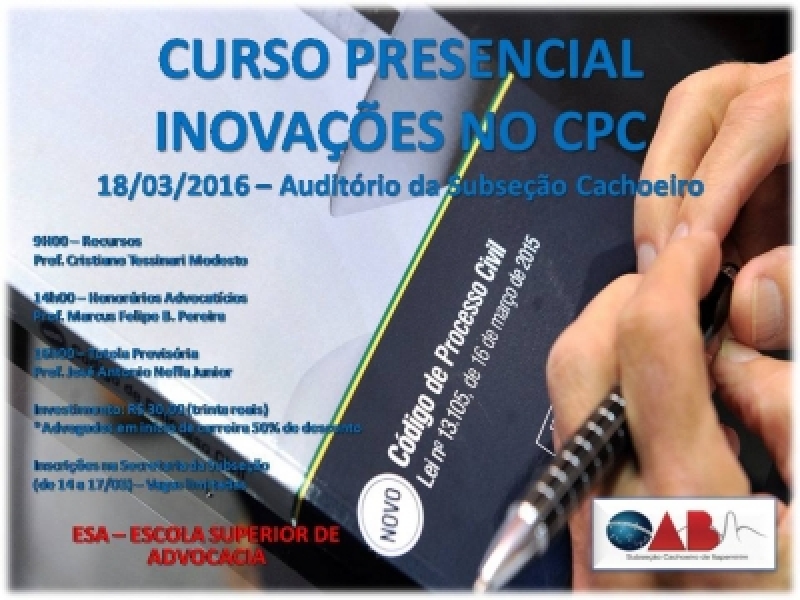 A Escola Superior de Advocacia da OAB-ES em parceria com a Subseção Cachoeiro, vai oferecer mais uma oportunidade para a atualização dos advogados em relação ao novo Código de Processo Civil. O curso será realizado na próxima sexta-feira (18), no auditório da Subseção Cachoeiro. Os advogados devem se apressar para fazer a inscrição, porque as vagas são limitadas.