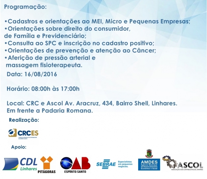 A 3ª Subseção de Linhares da OAB-ES foi convidada e vai apoiar e participar da iniciativa do Conselho Regional de Contabilidade do Estado que promoverá uma ação social na próxima terça-feira (16), em Linhares. Os advogados vão levar orientação à população nas áreas de direito previdenciário, consumidor e de família.