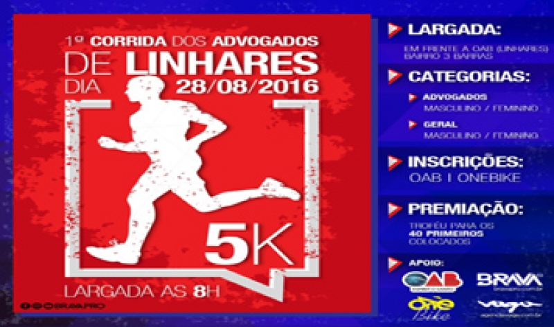 A 3ª Subseção de Linhares da OAB-ES vai promover a 1ª Corrida dos Advogados no próximo dia 28, com concentração às 07h e largada às 08 horas, em frente à sede da OAB. Deverá ser percorrida a distância de cinco quilômetros. O objetivo do evento é incentivar a prática saudável da atividade física, proporcionando a interação entre os advogados e sociedade.