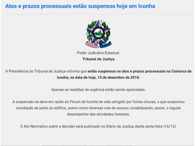 O Tribunal de Justiça do Espírito Santo informou que estão suspensos os atos e prazos processuais na Comarca de Iconha, nesta quinta-feira (15), em razão do Fórum da cidade ter sido atingido por fortes chuvas. O grande volume de água inundou parte do edifício, assim como diversas vias de acesso, inviabilizando o regular desempenho das atividades forenses.