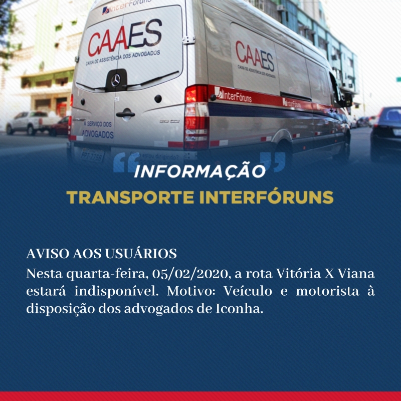 O transporte interfóruns da rota Vitoria x Viana estará indisponível nesta quarta-feira (05/02). O veículo e o motorista estarão à disposição dos advogados de Iconha que foram prejudicados pelas fortes chuvas que atingiram a região nos últimos dias.