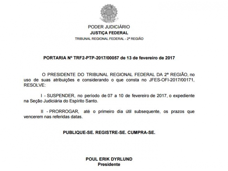 O presidente do TRF2, desembargador federal Poul Erik Dyrlund, assinou a Portaria nº TRF2-PTP-2017/00057, que suspende, no período de 7 a 10 de fevereiro de 2017, o expediente na Seção Judiciária do Espírito Santo. A referida Portaria também prorroga, até o primeiro dia útil subsequente, os prazos que vencerem nas referidas datas.