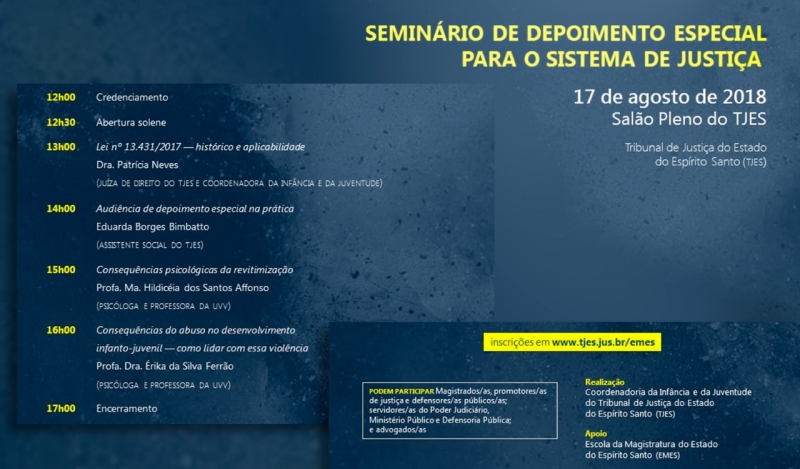 O Tribunal de Justiça do Espírito Santo (TJES) promove no próximo dia 17 de agosto o Seminário de Depoimento Especial para o Sistema de Justiça. O evento é uma realização da Coordenadoria da Infância e da Juventude do TJES, com o apoio da Escola da Magistratura do Espírito Santo (Emes).