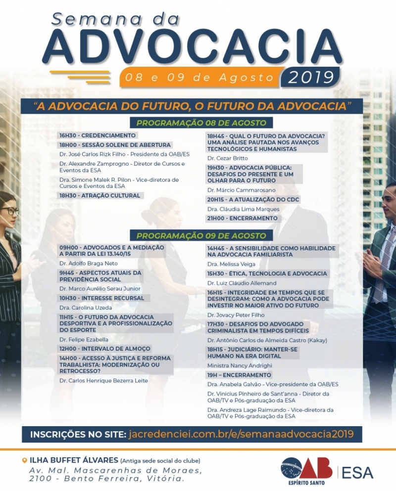Se ainda não fez as inscrições, acesse o link e garanta sua vaga: https://jacredenciei.com.br/e/semanaadvocacia2019