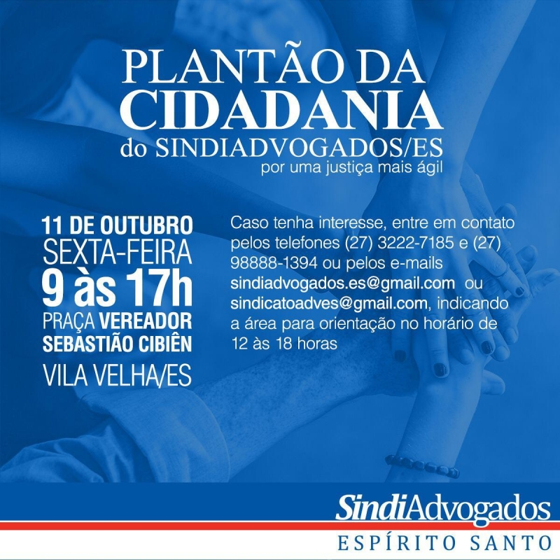 Devido ao grande sucesso com os “Primeiros Plantões da Cidadania” o Sindicato dos Advogados do Estado do Espírito Santo – Sindiadvogados/ES, tem o prazer de convidar o ilustre colega para participar do evento intitulado “I Plantão da Cidadania do SINDIADVOGADOS/ES em Vila Velha” que será realizado na Praça Vereador Sebastião Cibiên, situada no bairro Cobilândia, na cidade de Vila Velha/ES, o “1º Plantão da Cidadania Vila Velha” na (quadra de esportes), no dia 11 de outubro de 2019 (sexta-feira), das 09:00 às 17:00 horas, com plantão mínimo de duas horas.