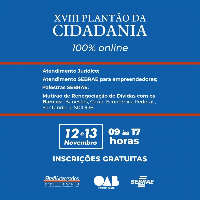 O XVIII Plantão da Cidadania dos Advogados do Estado do Espírito Santo (Sindiadvogados-ES) acontece nesta quinta-feira (12) e sexta-feira (13) totalmente de forma on-line.