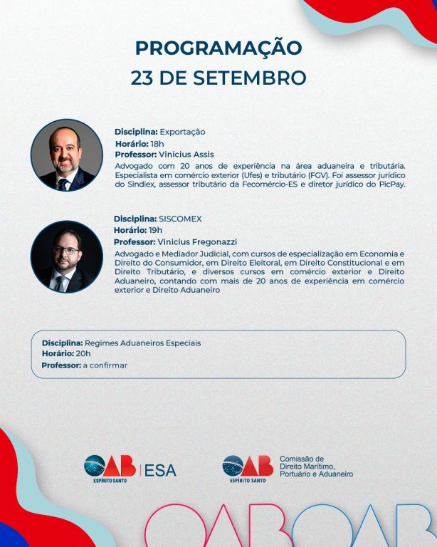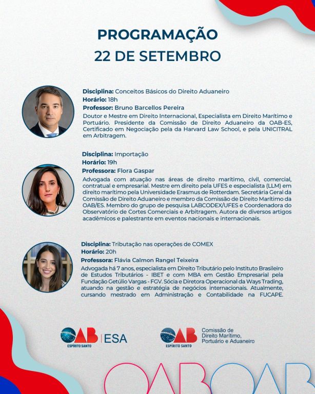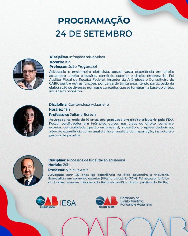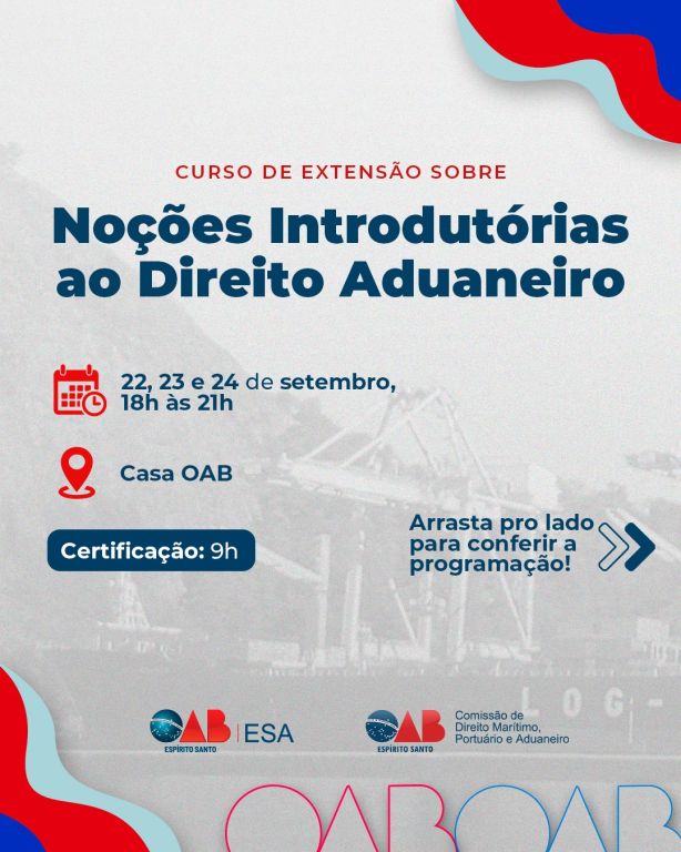 Eventos PresenciaisCurso de Extensão sobre Noções Introdutórias ao Direito Aduaneiro22 de Setembro de 2025 à 24 de Setembro de 2025. 18h00 às 21h00As inscrições para esse evento estão encerradas.