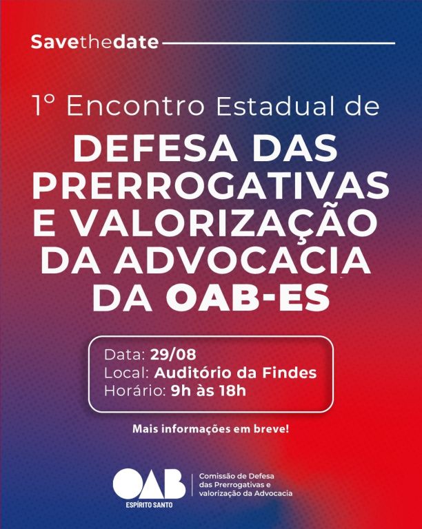 Eventos Presenciais1° Encontro Estadual de Defesa das Prerrogativas e Valorização da Advocacia da OAB/ES29 de Agosto de 2025. 09h00 às 18h00Local: Auditório Findes