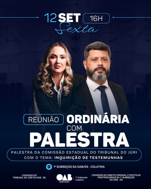Eventos PresenciaisReunião Ordinária com Palestra da Comissão de Tribunal do Júri12 de Setembro de 2025. 16h00 mode_editFaça sua inscrição
