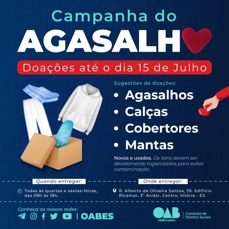 Ainda dá tempo de contribuir e ser solidário participando da terceira edição da Campanha do Agasalho da OAB-ES para aquecer quem mais precisa. Grande parte das famílias que vivem em situação de vulnerabilidade poderão enfrentar dificuldades neste inverno. A Comissão de Direitos Sociais convida a advocacia e a sociedade capixaba a aderir a campanha.
