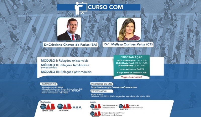 O curso, com carga horária certificada de 10h será ministrado pelo promotor de Justiça do MP da Bahia e mestre em Famílias na Sociedade Contemporânea, Cristiano Chaves de Farias, e pela advogada do Ceará e mestre em Direito Privado, Melissa Ourives Veiga. Segundo o promotor Cristiano Chaves de Faria o curso fará “uma grande revisão pela jurisprudência mais atual, mais contemporânea do STF do STJ no que diz respeito às relações patrimoniais, existências privadas. São as relações familiares, são as relações de propriedade, de titularidade”, disse ele.