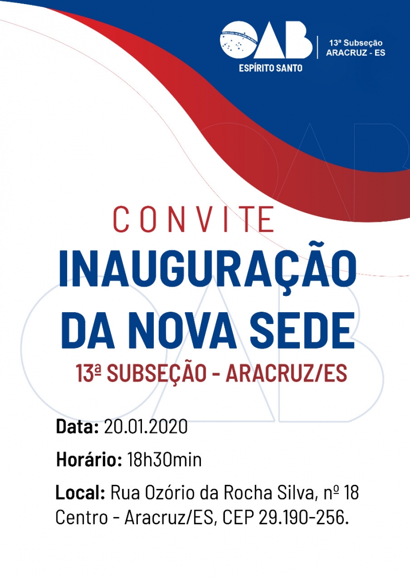 A 13ª Subseção de Aracruz vai ganhar uma nova sede nesta segunda-feira (20/01). A inauguração acontece às 18h e contará com a presença do presidente da OAB-ES, José Carlos Rizk Filho, e do presidente da Subseção, Filipe Selvatici Santos.