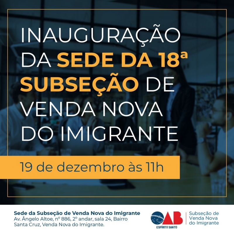 A 18ª Subseção de Venda Nova do Imigrante vai ganhar sua sede na próxima quinta-feira (19/12). A inauguração acontece às 11 horas, e a Subseção funcionará na avenida Ângelo Altoé, 886, 2º andar, sala 24, bairro Santa Cruz.