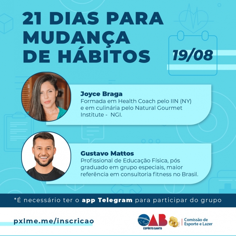 A OAB-ES, por meio da Comissão de Esporte e Lazer, abriu as inscrições para participar do Desafio 21 dias para mudanças de hábitos. Para se inscrever bastar acessar o link http://oabes.org.br/inscricao/comissao-esporte-lazer
