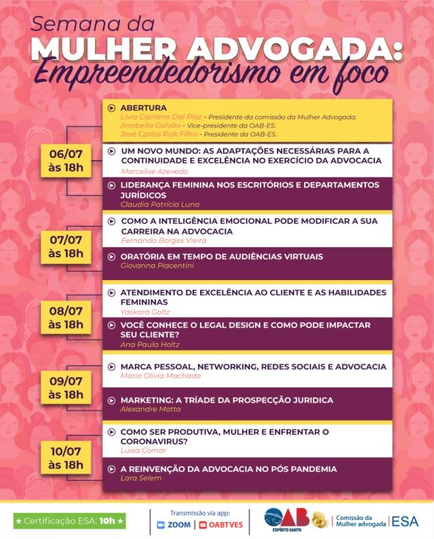 As palestras prosseguem até sexta-feira (10), sempre às 18h, com a participação de palestrantes renomados e debatedores locais. As advogadas inscritas pelo zoom terão certificado da ESA-ES.