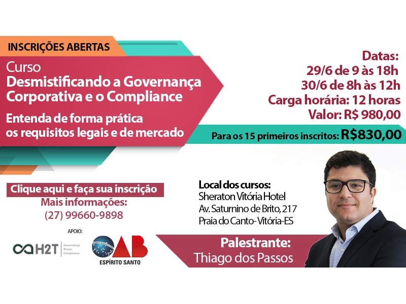 Os advogados regularmente inscritos na OAB-ES terão direito um desconto especial para participar do curso “Desmistificando a Governança Corporativa e o Compliance” pela Qualificare Cursos. Os primeiros quinze inscritos e os advogados em início de carreira serão beneficiados com um valor ainda mais reduzido.