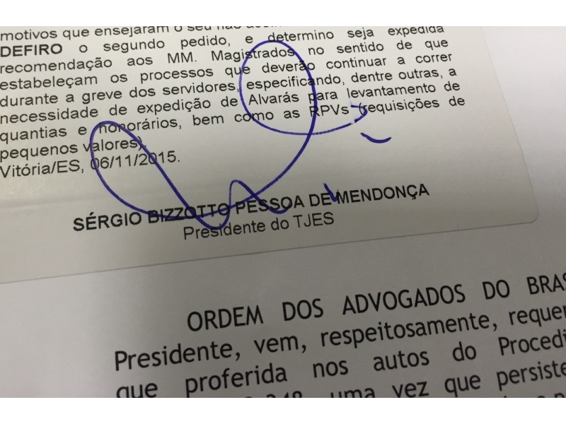 No último dia 9, o presidente do Tribunal de Justiça do Espírito Santo (TJES), desembargador Sérgio Bizzoto, acolheu a solicitação da Ordem, e expediu uma orientação aos magistrados, no sentido de que estabeleçam os processos que devem continuar correndo durante a greve dos servidores. Ele citou, especificamente, a necessidade de expedição de alvarás para levantamento de quantias e honorários, bem como para as RPV (requisições de pequenos valores).
