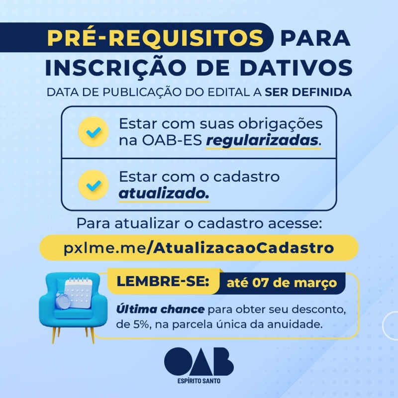 Um dos requisitos para advogados e advogadas fazerem a inscrição para Dativos neste ano de 2022 é estar com suas obrigações regularizadas junto à OAB-ES. Além disso, é necessário, ainda, estar com o cadastro atualizado.