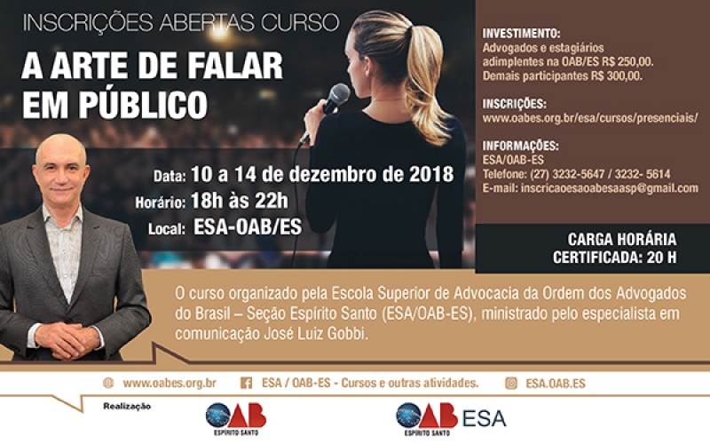 A oratória é uma ferramenta essencial na vida de um advogado. Pensando nisso, a Escola Superior de Advocacia da Ordem dos Advogados do Brasil – Seção Espírito Santo (ESA/OAB-ES) vai oferecer mais uma vez o curso com o tema “A Arte de Falar em Público”, ministrado pelo especialista em comunicação José Luiz Gobbi.