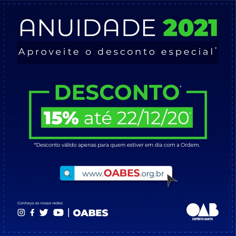 Os boletos já estão disponíveis no site da OAB-ES. Esse desconto de 15% com vencimento dia 22/12/2020 é para advogados (as) que, até outubro de 2020, estavam em dia com o pagamento das anuidades e parcelas