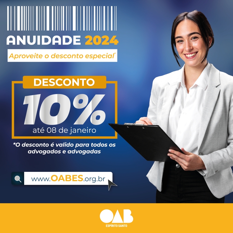 A Ordem dos Advogados do Brasil - Seccional Espírito Santo (OAB-ES) vai oferecer aos advogados (as) o desconto de 10% na anuidade para pagamento em parcela única, até o próximo dia 8 de janeiro de 2024.