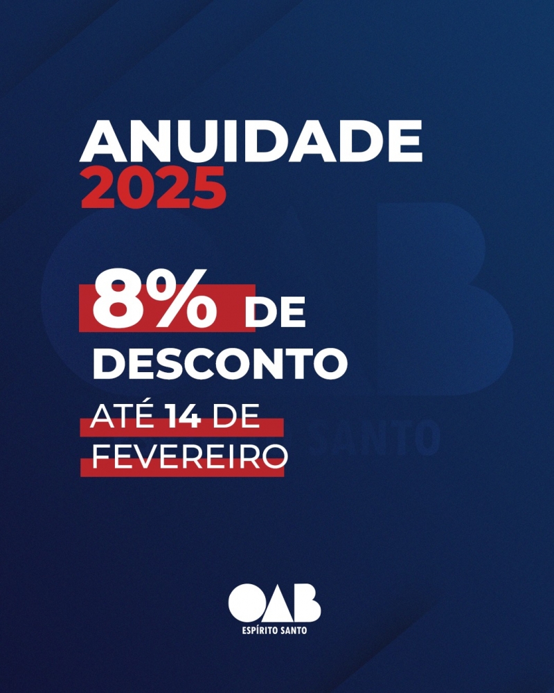 A Ordem dos Advogados do Brasil Seccional Espírito Santo (OAB-ES) está disponibilizando até o dia 14 de fevereiro o desconto de 8% incidente na parcela única da anuidade, referente ao ano de 2025.