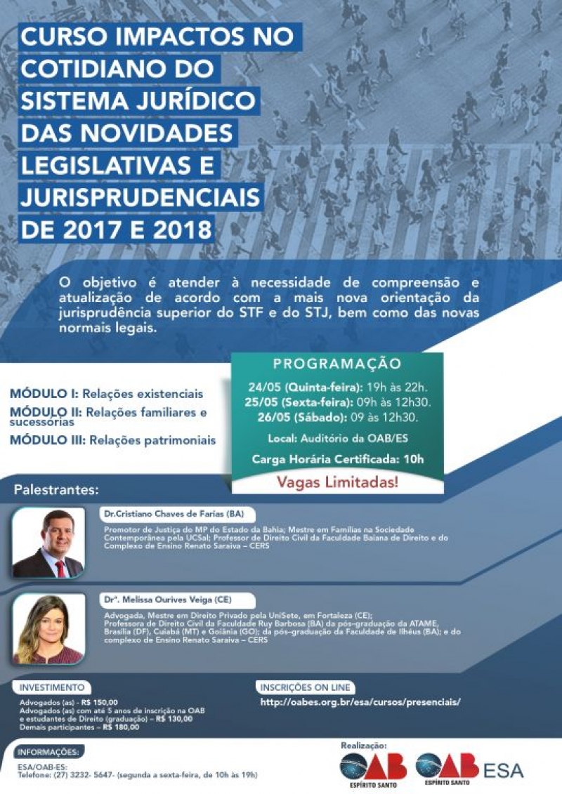 Inscrições on-line:http://www.oabes.org.br/esa/cursos/presenciais/