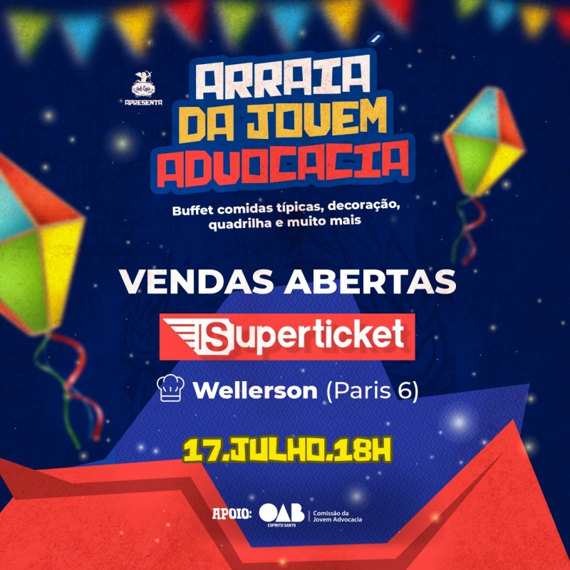 Bufê com comidas típicas, decoração, quadrilha e muito mais! A Comissão da Advocacia Jovem (OAB Jovem) da Ordem dos Advogados do Brasil, Seccional Espírito Santo (OAB-ES) realizará, no dia 17 de julho, o Arraiá da Jovem Advocacia. O evento irá ocorrer no Santo Cupido Vix, às 18h.