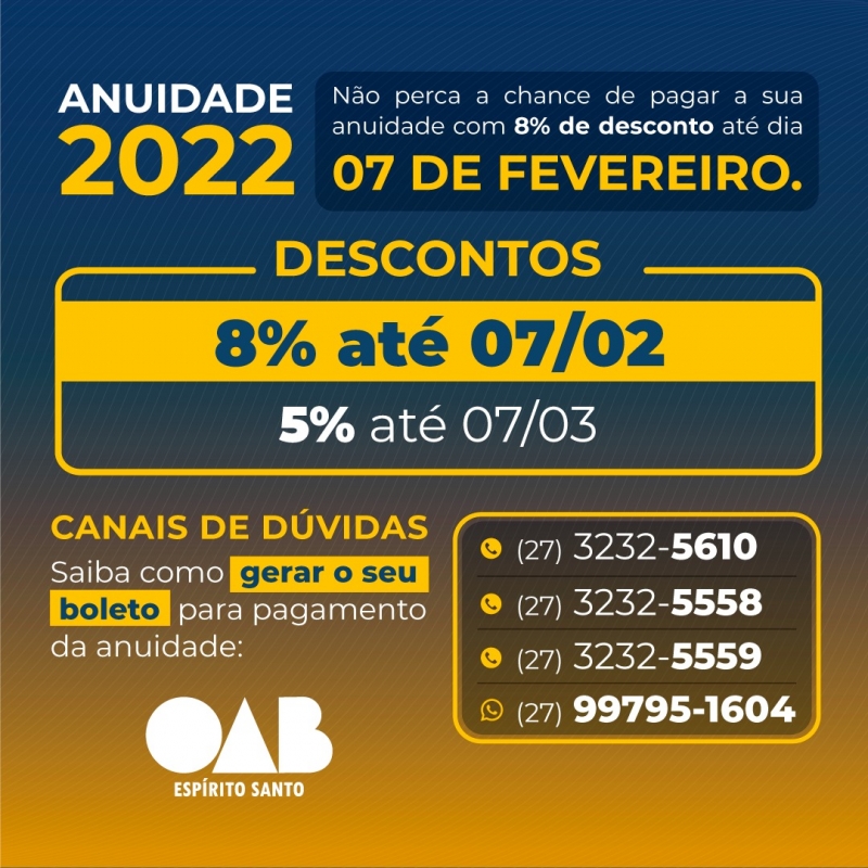 A Ordem dos Advogados do Brasil - Seccional Espírito Santo (OAB-ES) vai oferecer aos advogados (as) o desconto de 8% na anuidade para pagamento em parcela única, até o próximo dia 7 de fevereiro.