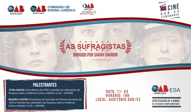 Para comemorar o Mês da Mulher, o Cine OAB, que acontece no próximo dia 11 de abril, vai ser especial: o filme escolhido é "As Sufragistas". Baseado em fatos reais, o filme conta a história do início da luta do movimento feminista e os métodos incomuns de batalha das mulheres que enfrentaram seus limites pela causa e desafiaram o Estado opressor, na luta para obter o direito ao voto. Dirigido por Sarah Gavron, o filme conta com grande elenco: Meryl Streep, Amanda Lawrence, Ben Whishaw, dentre outros.