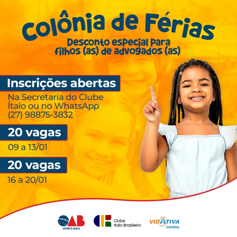 Para os advogados interessados em proporcionar momentos de alegria, diversão e integração a seus filhos no período de férias escolares, a Ordem dos Advogados do Brasil - Seccional Espírito Santo (OAB- ES) firmou uma parceria com a Vida Ativa Eventos e o Clube Ítalo Brasileiro que vai garantir descontos especiais em uma Colônia de Férias neste mês de janeiro.