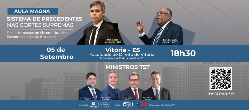 A cidade de Vitória será palco, no dia 5 de setembro, às 18h30, da primeira Open Class do segundo semestre do MBA em Direito, iniciativa que promove ao longo do ano encontros presenciais com transmissão ao vivo em diferentes municípios brasileiros. A aula reunirá ministros do Supremo Tribunal Federal (STF), Superior Tribunal de Justiça (STJ) e Tribunal Superior do Trabalho (TST) para discutir o impacto do sistema de precedentes nas esferas jurídica, econômica e social. O evento, que acontece na sede da Faculdade de Direito de Vitória (FDV), é um oferecimento da UNOESC em parceria com a OAB-ES.
