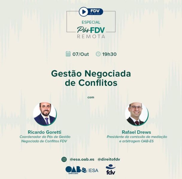 Com: Ricardo Goretti, coordenador da Pós de Gestão Negociada de Conflitos FDV, e Rafael Drews, presidente da Comissão de Mediação e Arbitragem da OAB-ES