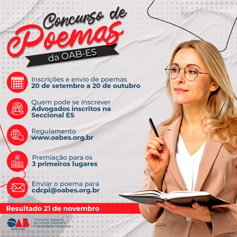 Os interessados em participar podem ser inscrever e enviar os poemas até o dia 20 de outubro para o endereço de e-mail cdcpi@oabes.org.br.