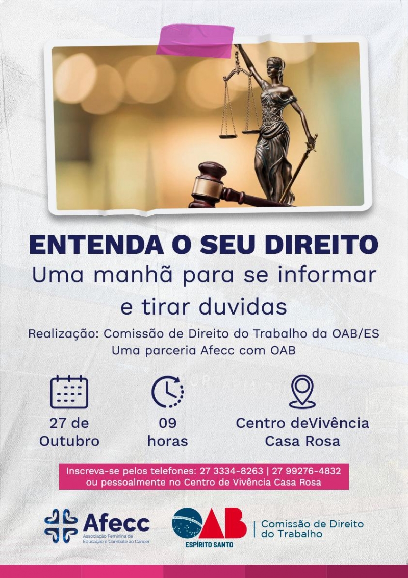 A OAB-ES por meio da sua Comissão de Direito do Trabalho vai realizar uma roda de conversa sobre os Direitos das pessoas em tratamento contra o câncer na Afecc nesta sexta-feira (27/10), das 9h às 11h.