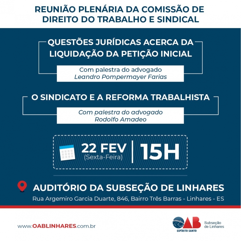 Com a proposta de ampliar os trabalhos desenvolvidos, em consonância com o objetivo da diretoria da Seccional, a Comissão de Direito do Trabalho e Sindical da OAB-ES irá realizar sua segunda reunião na Subseção de Linhares, na próxima semana, dia 22. No mesmo momento serão ministradas duas palestras.