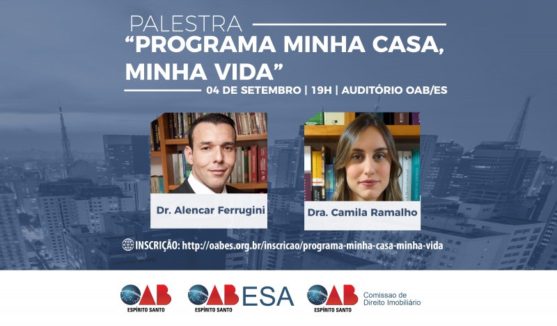 A Comissão Especial de Direito Imobiliário da Ordem dos Advogados do Brasil - Seção Espírito Santo (OAB/ES) realiza, gratuitamente, a palestra “Programa Minha Casa, Minha Vida”, que será ministrada pelo advogado Alencar Ferrugini e pela advogada Camila Villa Nova Ramalho. O evento acontece nesta terça-feira (4/9), às 19h, gratuitamente, no auditório da OAB/ES.