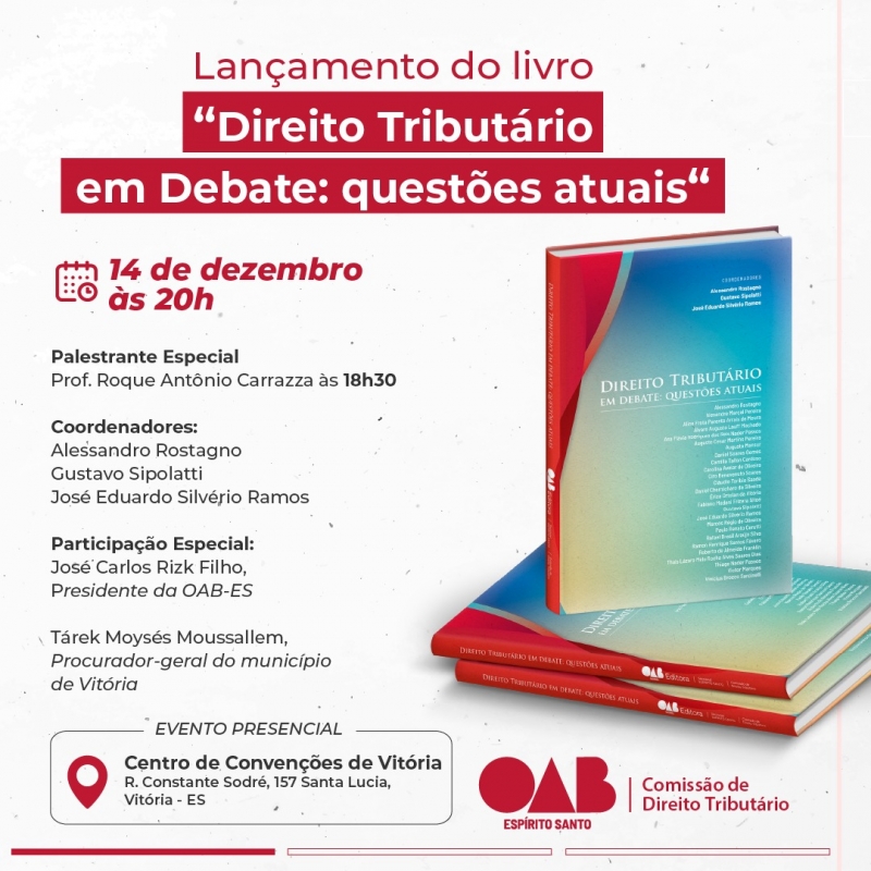 Comissão de Direito Tributário lança livro no Centro de Convenções de Vitória, nesta terça-feira (14/12)