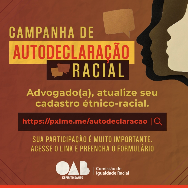 Com o compromisso de promover a inclusão e tornar a Ordem dos Advogados do Brasil, Seccional Espírito Santo (OAB-ES) um espaço ainda mais democrático, a Comissão de Igualdade Racial da OAB-ES lança a Campanha de Autodeclaração étnico-racial a fim de obter dados quantitativos de advogados e advogadas pretos (as) e pardos (as) em exercício no Estado do Espírito Santo. A partir deste estudo, a Seccional poderá construir um panorama da realidade regional e planejar ações voltadas às políticas afirmativas de inclusão e defesa de prerrogativas dos advogados e advogadas pretos (as) e pardos (as) inscritos nos quadros da Ordem.
