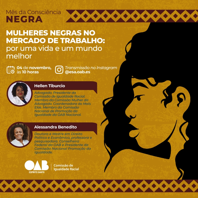 Nesta sexta-feira (04/11), a partir das 10h, será realizado, através do perfil oficial da Escola Superior de Advocacia (ESA-ES) no Instagram, uma live com o tema “Mulheres negras no mercado de trabalho: uma luta constante por uma vida e um mundo melhor”. A presidente da Comissão de Igualdade Racial da OAB-ES, Hellen Tiburcio, estará conversando com a presidente da Comissão Nacional de Promoção da Igualdade, da OAB, a advogada Alessandra Benedito.