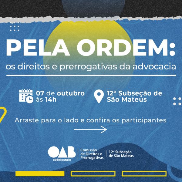 A Ordem dos Advogados do Brasil, Seccional Espírito Santo (OAB-ES), por meio da Comissão de Direito e Prerrogativas, está promovendo um ciclo de palestras em diversas Subseções do Estado com o tema "Pela Ordem: Para falar sobre Direitos e Prerrogativas da Advocaci"a.