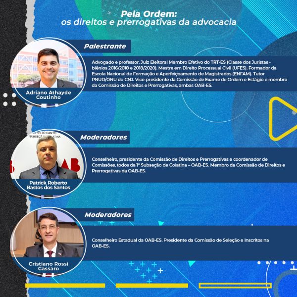 O evento contará com palestra do advogado e juiz eleitoral membro efetivo do TR-ES, Adriano Athayde Coutinho, com moderação do presidente da Comissão de Direitos e Prerrogativas e Corrdenador de Comissões da Subseção de Colatina, Patrick Roberto Bastos dos Santos, e do Conselheiro Estadual e presidente da Comissão de Seleção e Inscritos da OAB-ES, Cristiano Rossi Cassaro.