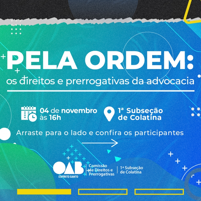 A Ordem dos Advogados do Brasil, Seccional Espírito Santo (OAB-ES), por meio da Comissão de Direito e Prerrogativas, realiza na 1ª Subseção de Colatina, no dia 04/11, às 16 horas, mais uma palestra, dentro do ciclo de encontros que estão acontecendo em diversas Subseções do Estado, dentro do projeto "Pela Ordem: Os Direitos e Prerrogativas da Advocacia".
