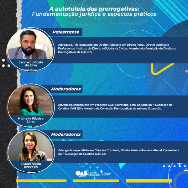 O outro palestrante será o advogado, membro da Comissão de Direitos e Prerrogativas da OAB-ES, Leonardo Costa da Silva, com moderação da advogada e secretária-geral adjunta da 1ª Subseção, Michelly Ribeiro Lima, e a advogada e Conselheira da 1ª Subseção de Colatina, Liviani Vilela Azevedo.