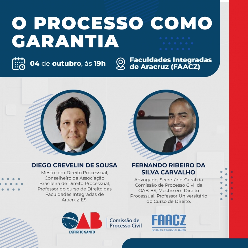A Comissão de Processo Civil da Ordem dos Advogados do Brasil, Seccional Espírito Santo (OAB-ES) realiza, no dia 4 de outubro, às 19h, em Aracruz, um evento sobre “O processo como garantia”.