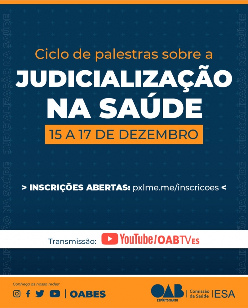 Nos dias 15, 16 e 17 de dezembro, a Comissão da Saúde da OAB-ES e a ESA-ES realizam o ciclo de palestras sobre Judicialização na Saúde. O evento será dividido em diversas apresentações diferentes sobre o tema.