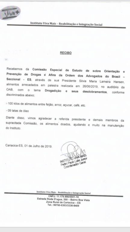 No dia 28 de junho pela manhã, a Comissão Especial de Estudo sobre Orientação e Prevenção de Drogas e Afins entregou mais de 100 kg de alimentos ao Instituto Viva Mais Reabilitação e Integração Social. Os alimentos foram arrecadados no evento realizado pela Comissão com o tema “Drogadição e seus Desdobramentos”, realizado no dia 26 de junho, Dia Mundial de Combate às Drogas, na sede da Ordem dos Advogados do Brasil - Seccional do Espírito Santo (OAB-ES).