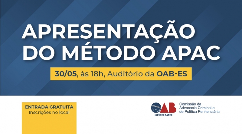 O método APAC, que representa um grande avanço para o processo de ressocialização de presos, será a pauta do evento organizado pela Comissão da Advocacia Criminal e de Política Penitenciária da OAB-ES, no dia 30 de maio, às 18 horas, na sede da Seccional. O objetivo é apresentar à advocacia o trabalho desenvolvido pela APAC e mostrar quais são os requisitos para que o preso faça parte desse sistema.