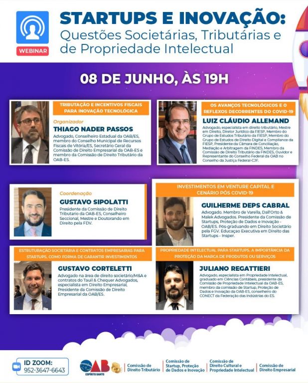 Também se apresentaram o presidente da Comissão de Startups, Guilherme Deps Cabral, falando sobre “Investimentos em Venture Capital e Cenários pós COVID-19”; o presidente da comissão de Direito Empresarial, Gustavo Corteletti, abordando a “Estruturação Societária e os contratos empresarias imprescindíveis para atuação e segurança das Startups, inclusive como forma de garantir investimentos” e o conselheiro estadual , Thiago Nader Passos que abordou sobre a “Tributação e os Incentivos fiscais para inovação tecnológica”.