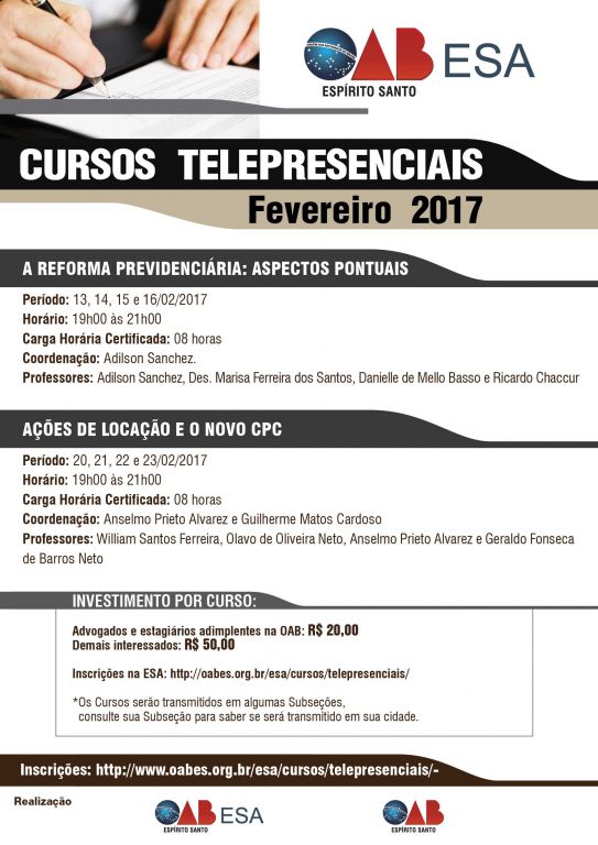 As atividades na Escola Superior de Advocacia da Ordem dos Advogados do Brasil – Seção Espírito Santo (OAB-ES) foram retomadas neste mês de fevereiro. E para marcar o ano novo, uma série de cursos telepresenciais está sendo oferecida para a advocacia. O foco dos cursos é a reforma previdenciária e o novo CPC.